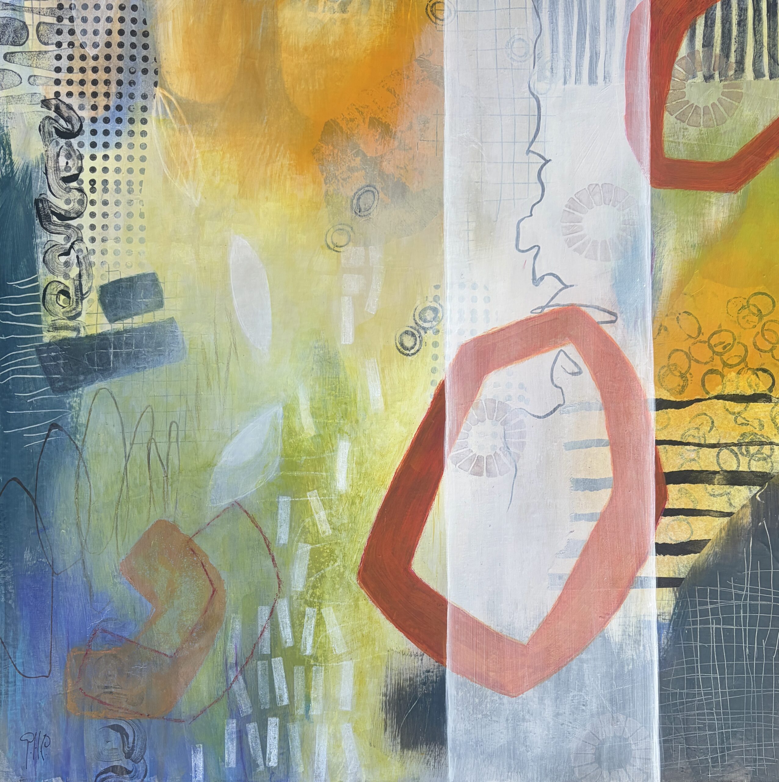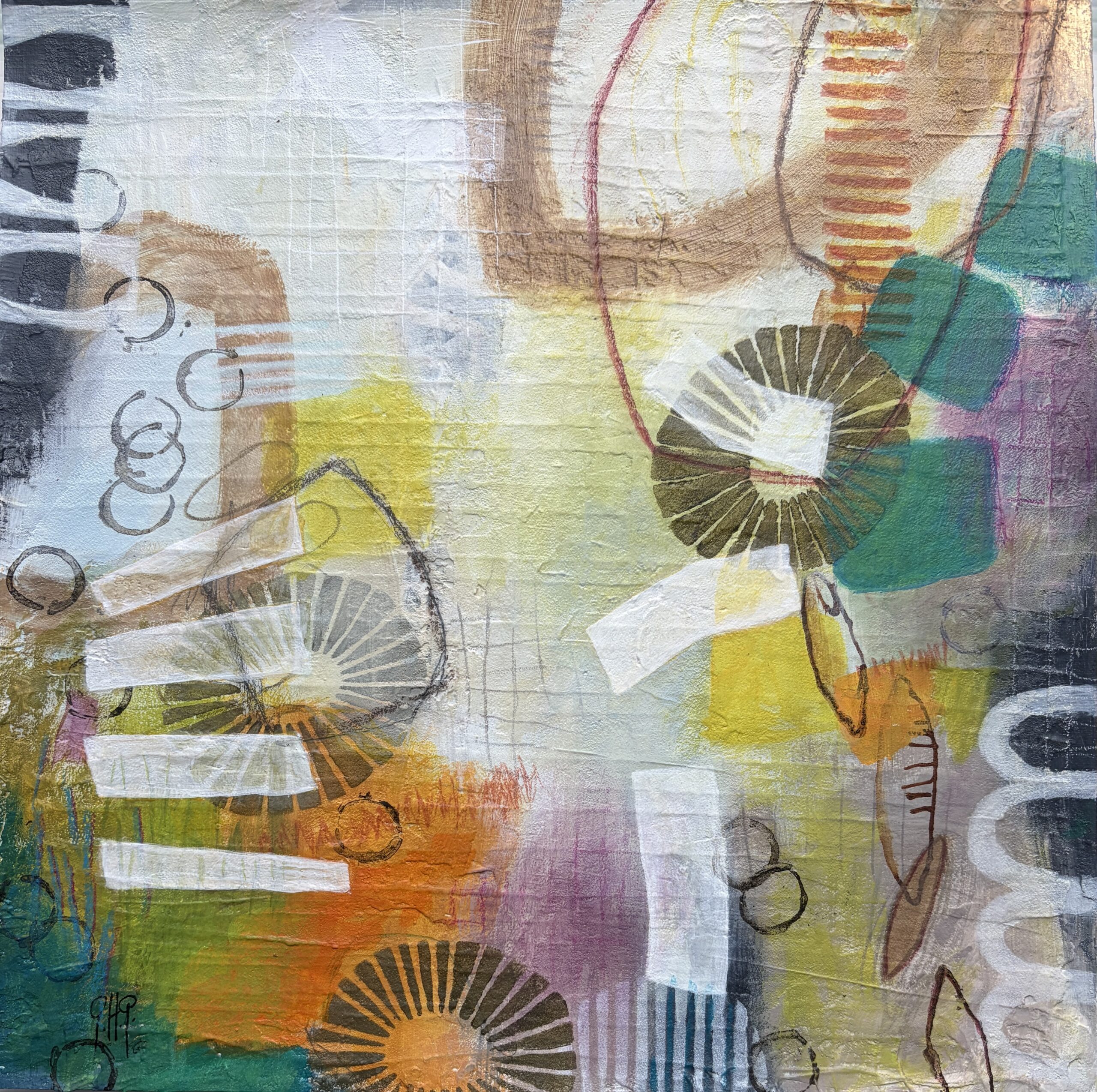 acrylics and mixed media on paper on wood panel 12″x12″x7/8″